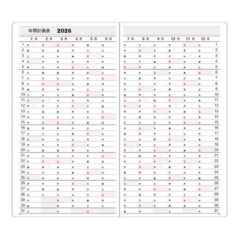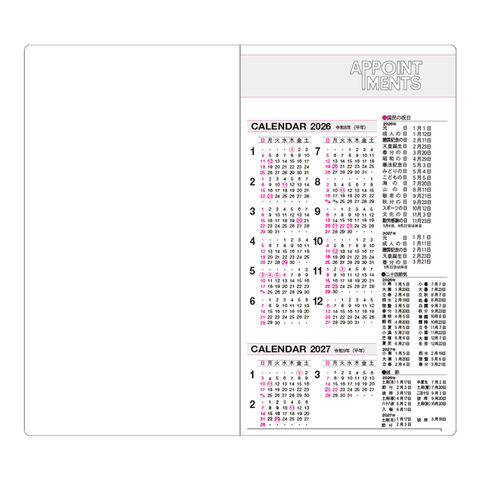独特のスタイルが好評の見開き1ヶ月ダイアリーです。仕様:塩ビ製差込表紙、中ミシンとじ 内容:年間計画表、月間ダイアリー、ノート、アドレス、資料編