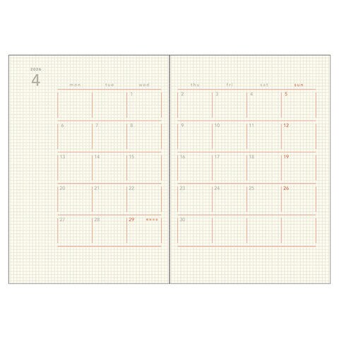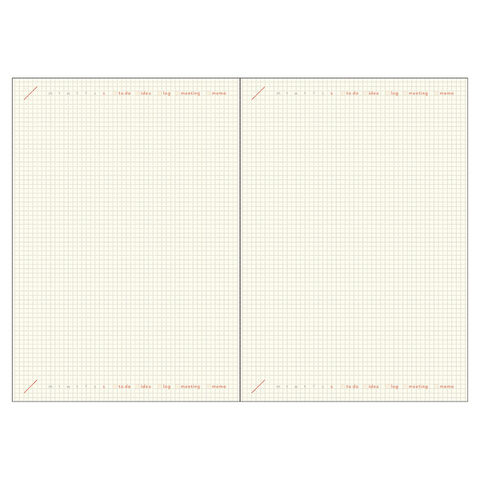 月間は余白がたっぷりで自由に使えます。ベースの2.5mm方眼は線をひいたり文頭を揃えるガイドにできます。フリーメモは必要な時に書きたい分だけ書けるフォーマット。ダイアリーと一緒に管理したい情報や記録を簡単にメモしておける、ちょうどいいページ数です。