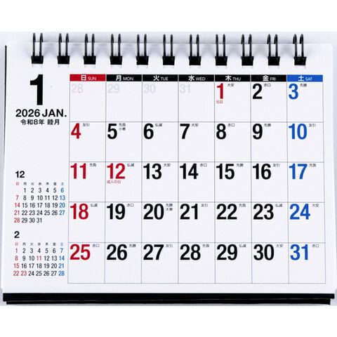 名刺より一回り大きいA7サイズのカレンダー。小さいながら前次月のカレンダーも見られる優れもの。年間一覧カレンダーが付いていて、とても便利。裏面は横ケイメモ付き。エコで地球にやさしい、シンプルな卓上タイプのカレンダー[高橋で最小のA7サイズ]