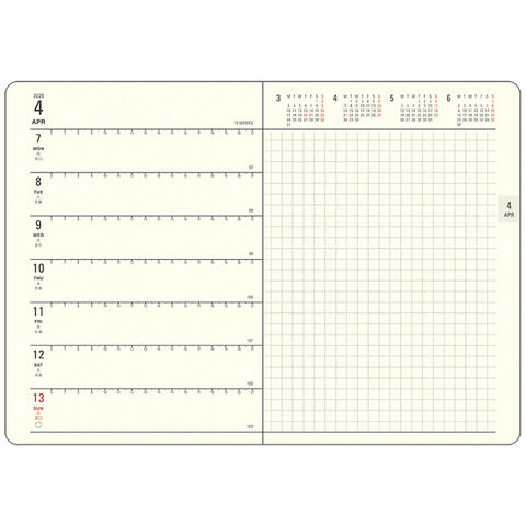●色:ミント●規格サイズ:A6●表紙素材:PVC●ページ数:176●始まり曜日:月曜日●始まり月:3●主レイアウト:1週間+方眼●レイアウト1:ウィークリー●レイアウト2:週間●レイアウト3:レフト●六曜の有無:有●付録:カレンダー・年間スケジュール・バースデー、記念日リスト・ID、パスワードリスト・サイクルカレンダー・換算表・年齢早見表・困ったときの連絡先リスト・パーソナルノート●掲載期間(月間ページ):2025年3月~2026年3月●掲載期間(週間ページ):2025年3月~2026年3月●カタログ名:Appoint MILL 2025-26 DIARY CATALOG●カタログ掲載