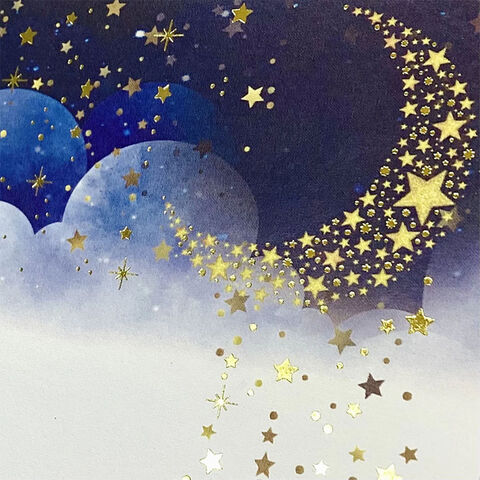 ブルーの濃淡で表現された奥行きある空に、金箔加工の月や星が映える幻想的なデザイン。