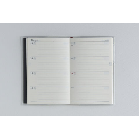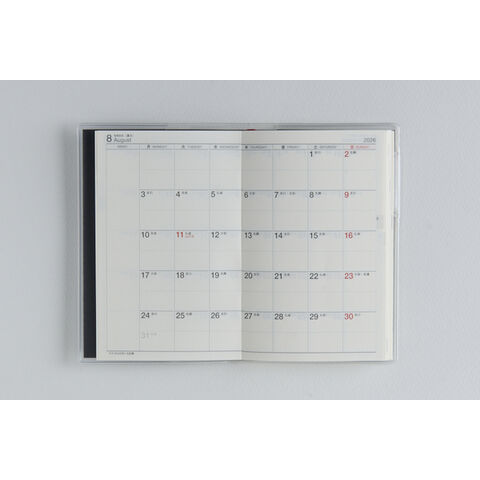【月間予定表】カレンダーと同じ感覚で見ることができ、週ごとの予定が把握しやすいブロック式。平日の仕事の予定や、週末土日の予定をまとめて書きやすい月曜始まり。左端の一列はフリーのメモ欄になっています。月間が巻頭にまとまっているので、前後月との流れが把握しやすく便利です。 【週間予定表】左ページには4日分のスケジュール欄、右ページには3日分のスケジュール欄とメモスペースを掲載。1日分の記入スペースが広いので、ビジネスユースはもちろん、ちょっとした日記としてもご使用いただけます。
