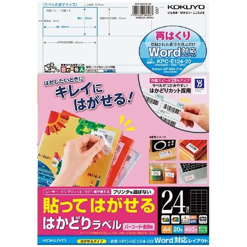 コクヨ 貼ってはがせる はがせるラベル A4 24面 20枚