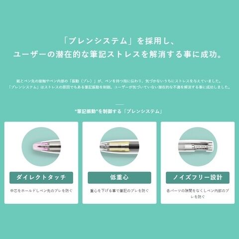 ペン内部の隙間をなくし、ペン中芯をホールドする部品や金属製の重りを内蔵した「ブレンシステム」を搭載することで筆記振動を防ぎます。