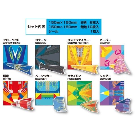 ・内容: 8柄 8枚入、無地おりがみ10枚入 シール1枚入、8種類のひこうきの折り図つき