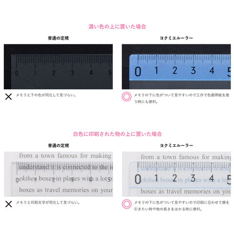 どんな色の上でもメモリが良く見える定規「ヨクミエルーラー」です。