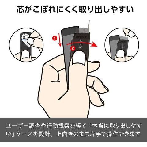 上向きのまま片手で操作可能で、芯をこぼすリスクを減らせます。