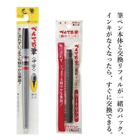 ぺんてるの筆ペン中字と詰め替え用のインクのセット。水性顔料インクを使用しており、乾きやすく、色が濃い。和紙など水を吸いやすい紙であっても、墨痕鮮やかに筆記することができる。また、発色の良さを活かして水墨画やイラストに使用することができる。水彩絵の具やポスターカラーなどであとから重ね書きしても、乾いていればにじまない。また、黒が強く残るため主線に向いている。