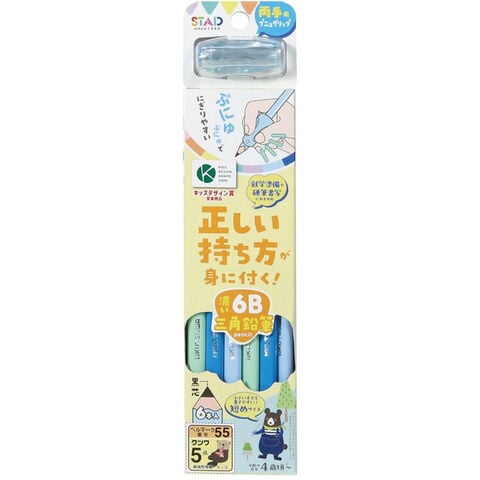 正しい持ち方えんぴつ 三角 鉛筆 6B 6本入 短めサイズ 両手用プニュグリップ付 4歳~ 入学準備 日本製 クツワ