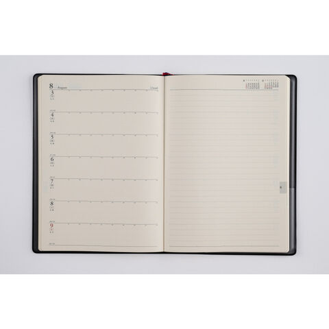 ビジネスシーンにも馴染むベーシックなカバーデザイン。記入形式は定番の月間ブロック式・週間レフト式のレイアウトです。巻末メモも30ページ以上あり、たくさんメモができるのも魅力の一つ。