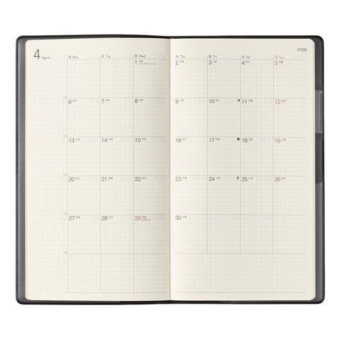 【月間ページ】見開き1ヶ月のベーシックなブロックタイプ(月曜始まり)。カレンダーと同じような感覚で見ることができ、週ごとの予定が把握しやすいのが特徴です。