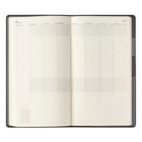 【週間ページ】見開き1週間で全面に時間軸を配置したバーチカルタイプ。1日に複数の予定が入る、スケジュール管理を重視したい方におすすめです。