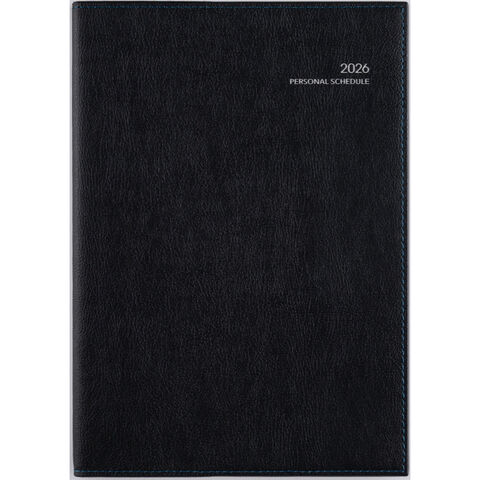 シックなカラーでステッチ入りのカバーは、毎年細部にまでこだわって製作しています。デスクで書くのにちょうどいいA5判で、マンスリータイプでもしっかり書きたい人にオススメです。