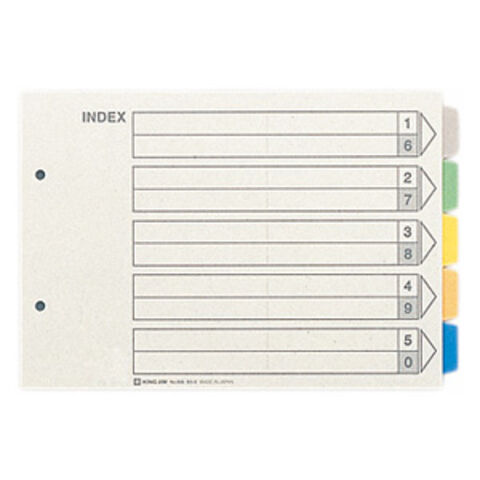 ファイル内の書類を分類・仕分けし、素早く書類を検索できるようにするファイル用見出しです。●規格:B5ヨコ●穴数:2穴●5色5山6枚1組●入数:1パック10組/40