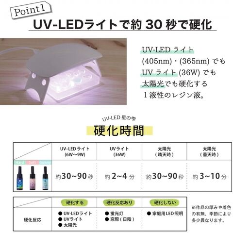 ●UV-LEDライト(405nm)でもUVライト(365nm)でも硬化する1液性レジン。