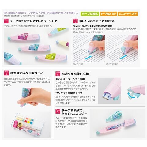 色の掛け合わせが楽しい!ペン型修正テープ。●修正テープ(つめ替えタイプ)●ローラーヘッド●仕様:本体●色:ペールグリーン●テープ幅×長:4mm×6m●●外形寸法:幅19×奥113×高26mm●タテ引きタイプ