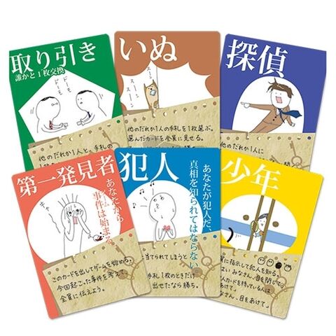 1. 事件が起きました。犯人は今日この場所に集まった、私たちの中にいます。バラバラに配られた全員の手札の中に、たった1枚だけ[犯人]カードがあります。この[犯人]を持っている人を当てられれば勝ち、当てられてしまうと負けです。
