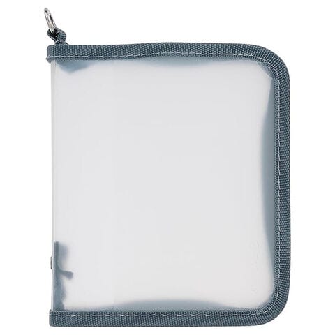 3辺を囲むラウンドファスナーで開閉でき、表紙側にはカードやシールなどが挟めるPVC素材の袖ポケットが1つあります。