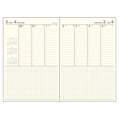 縦に時間ごとの目盛りが用意されたバーチカルレイアウトです。時間を細かく区切って管理しやすいのが特徴で、仕事で時間刻みのアポイントが入る営業職の方などにおすすめです。週間予定表の各ページには、前月・当月・次月と3ヶ月分のカレンダーが付いています。ページ下部にはフリーのメモスペースがあるので、メモをたくさん取りたい方にも。
