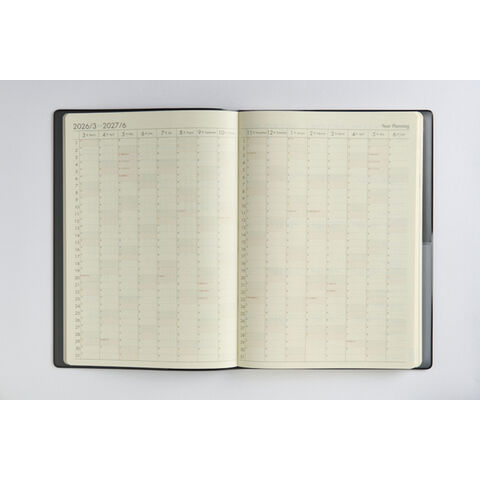 【月間予定表】カレンダーと同じような感覚で見ることができ、その月全体を俯瞰しやすいブロック式。 【週間予定表】左にスケジュール、右に横罫メモが付いているレフト式。スケジュール欄には時間目盛りが付いているので、複数の予定管理にも便利。メモスペースには会議の内容をメモしたり、思いついたことを書き込んだり、自由な使い方ができます。