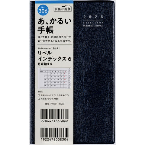 【送料無料】高橋書店 2026年 手帳・ダイアリー (306) リベルインデックス6月曜始まり 手帳判 ブルーオンノアール 見開き1か月 - メール便発送