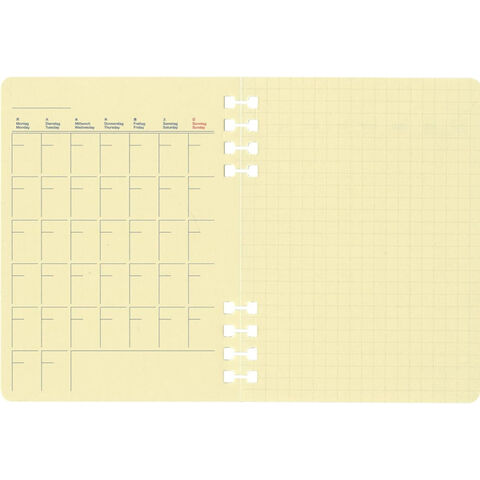 マンスリーリフィルは、裏面が5mm方眼メモになっているため、Mサイズの「ロルバーン フレキシブル」のカバーにセットすると、見開きの左ページがマンスリー、右ページが方眼メモになる機能的な構成。