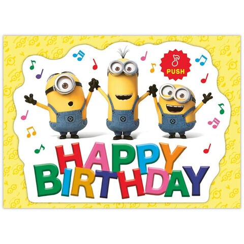 【送料無料】ミニオン オルゴールカード バンザイ 曲/バースデーソング セリフ入 グリーティング 飾れる 封筒付 誕生日 お祝い - メール便発送