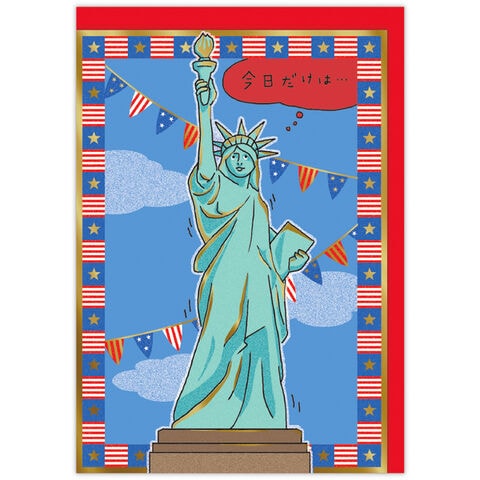 自由の女神がビル街から大空へ飛び出すインパクト大の「立体カード」です。