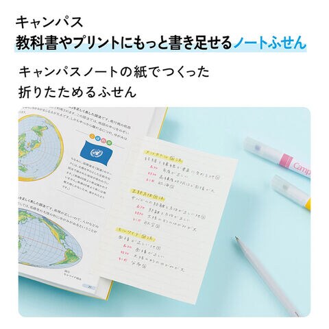 たくさん書けて、狭いスペースにも貼り足せる付箋「キャンパス 教科書やプリントにもっと書き足せるノートふせん」です。