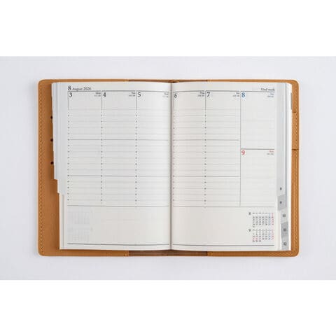 【月間予定表】ブロック式のカレンダーにはインデックスも付いていて便利です。前次月のカレンダーも載っているので、他の月も一覧できます。 【週間予定表】時間管理がしやすいバーティカル式は、1日に複数の予定が入りやすい方におすすめ。月曜日から金曜日までをたっぷり書き込める平日重視型の記入スペースです。