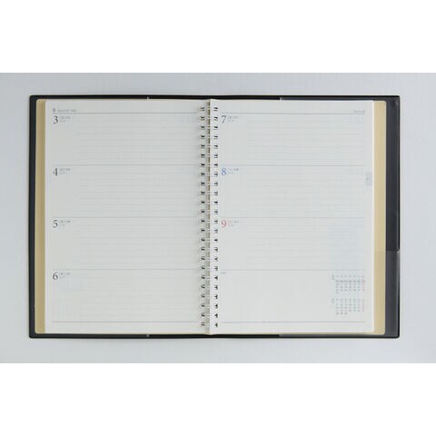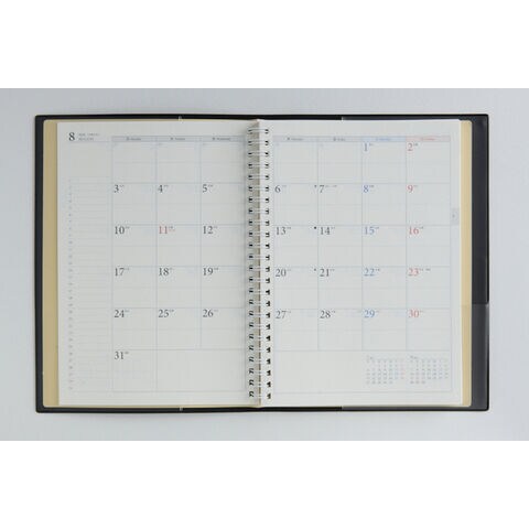 【月間予定表】カレンダーと同じ感覚で見ることができ、週ごとの予定が把握しやすいブロック式。1日の記入スペースが上下段に分かれているので、予定を書き分けるのに便利です。 【週間予定表】左ページには4日分のスケジュール欄、右ページには3日分のスケジュール欄とメモスペースを掲載。1日分の記入スペースが広いので、ビジネスユースはもちろん、ちょっとした日記としてもご使用いただけます。