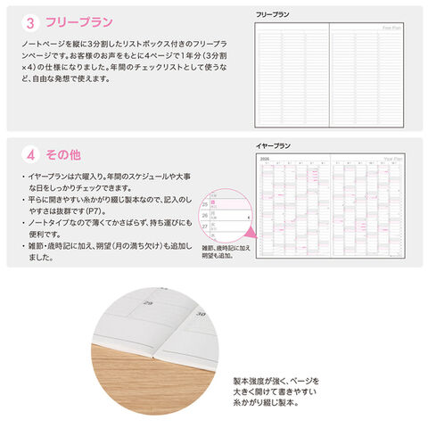 裏面も可愛いキャラクターデザイン!日曜始まり週のはじまりを日曜から意識することで快適な生活習慣を実現!カレンダーと同じ見え方なのでデスク用や2冊目の手帳としても最適です。ノートページはロジカル罫を採用ノートページは1ページ=24時間×31日の構成。一日一行で一か月の予定を組める仕様になっています。フリープランノートページを縦に3分割したリストボックス付きのフリープランページです。