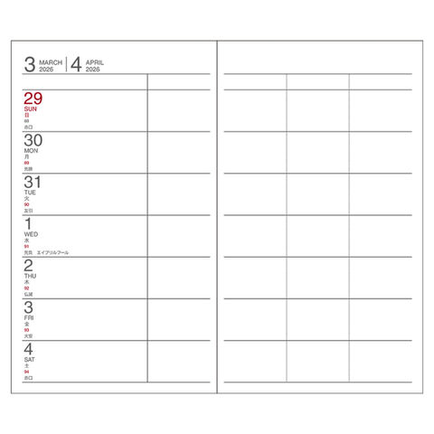 週間ページは自分で項目を決めて、予定を分けて管理できるレイアウトです。家族の予定を書いたり、案件ごとに分けて管理するビジネス手帳として、また習い事や習慣を記録するのにもおすすめです。
