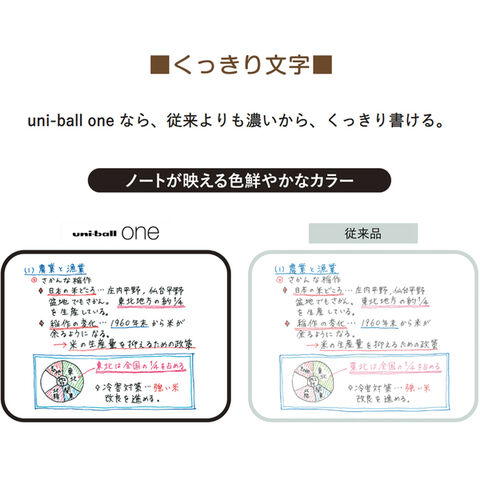 新開発の『uni-ball one(ユニボール ワン)』のインクは、一般的なゲルインクと異なり、色材の紙繊維への浸透を極力抑える、新しい顔料を使用しています。 黒は一層濃く、カラーはより鮮やかに発色し、記憶に残りやすい、くっきりキマる文字が書けます。