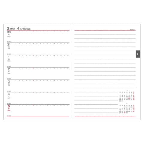左半分が1週間のスケジュール、右半分が横罫のメモスペースになっており1週間の予定とメモを見開きで管理できる人気のレイアウトです。1週間の予定をざっくり把握したい、フリースペースにメモを取りたい人におすすめです。