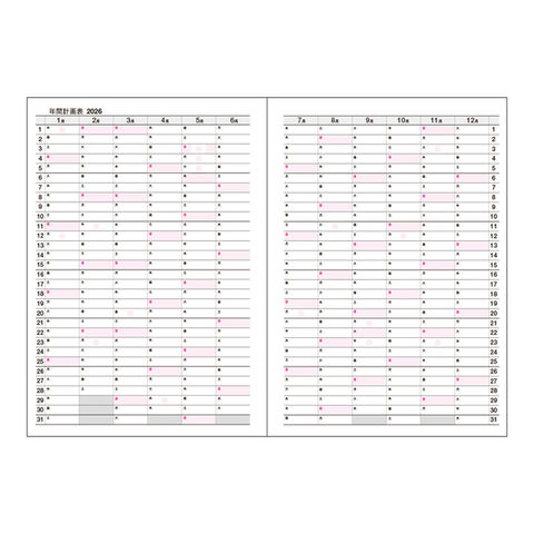 背がしなやかでとじ目まで開きやすい糸かがりとじ製本のブロックタイプ見開き1ヶ月ダイアリーです。仕様:塩ビ製差込表紙、糸かがりとじ 内容:年間計画表、プランニングテーブル、LIFE PLAN、月間ダイアリー、統計、ノート、アドレス、資料編
