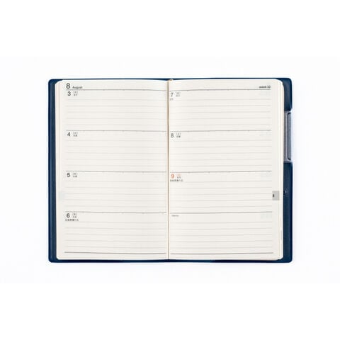 【月間予定表】カレンダーと同じような感覚で見ることができ、週ごとの予定が把握しやすいブロックタイプ。左端の一列はフリーのメモ欄になっています。 【週間予定表】左ページには4日分のスケジュール欄、右ページには3日分のスケジュール欄とメモ欄を掲載。1日分の記入スペースが広いので、ビジネスユースはもちろん、ちょっとした日記としてもご使用いただけます。
