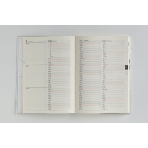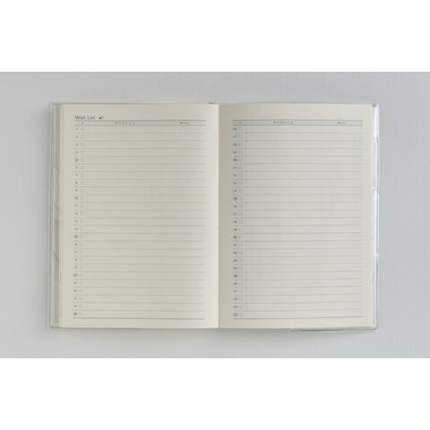【月間予定表】週をまたぐ予定を管理しやすい横罫式カレンダー。見開き1ページで3年分を書き残せるので、振り返りやすく便利です。 【週間予定表】巻末には横罫メモページとWish List・Gift List・Anniversary List付き。