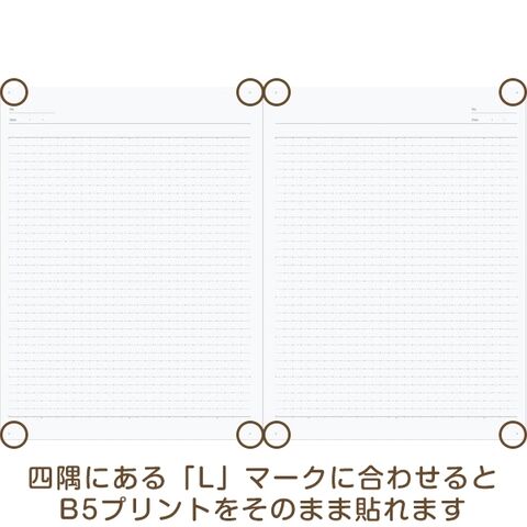 ・各ページの4隅にはB5サイズのプリントを貼る際の目印付き。