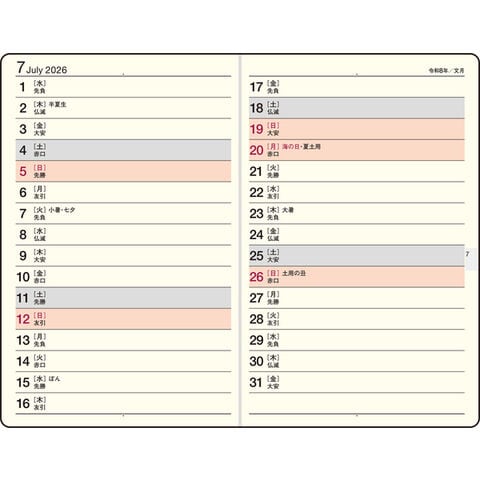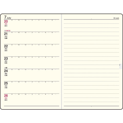 【月間予定表】長期にまたがるスケジュールや、複数の予定管理がしやすい横ケイ式。 【週間予定表】左にスケジュール、右に罫線メモが付いているレフト式。会議の内容をメモしたり、思いついたことを書き込んだり、自由な使い方ができます。