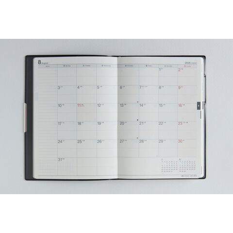 【月間予定表】カレンダーと同じ感覚で見ることができ、週ごとの予定が把握しやすいブロック式。平日の仕事の予定や、週末土日の予定をまとめて書きやすい月曜始まり。左端の一列はフリーのメモ欄になっています。月ごとに月間と週間が配置されているので、1ヵ月単位での管理が便利です。 【週間予定表】見開き1ページで1週間分のスケジュールを管理できるセパレート式。1日の記入スペースが広いので、ちょっとした日記としてもご使用いただけます。