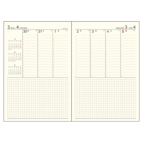 縦に時間ごとの目盛りが用意されたバーチカルレイアウトです。時間を細かく区切って管理しやすいのが特徴で、仕事で時間刻みのアポイントが入る営業職の方などにおすすめです。週間予定表の各ページには、前月・当月・次月と3ヶ月分のカレンダーが付いています。ページ下部にはフリーのメモスペースがあるので、メモをたくさん取りたい方にも。