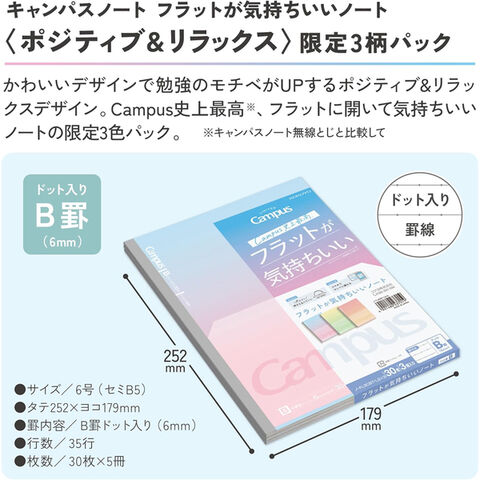 限定 キャンパス フラットが気持ちいいノート ポジティブ&リラックス セミB5 3冊パック B罫/6mm ドット入 中高生 コクヨ