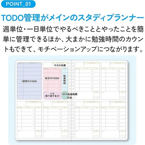 ・日々の勉強計画を立てられるソフトリングノートタイプのスタディプランナーです。