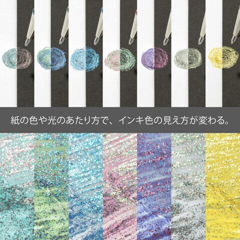 白い紙では鮮やかに、黒などの濃く深い色の紙ではグリッターの輝きがきわだち幻想的に、1本で多彩な表現をお楽しみいただけます。