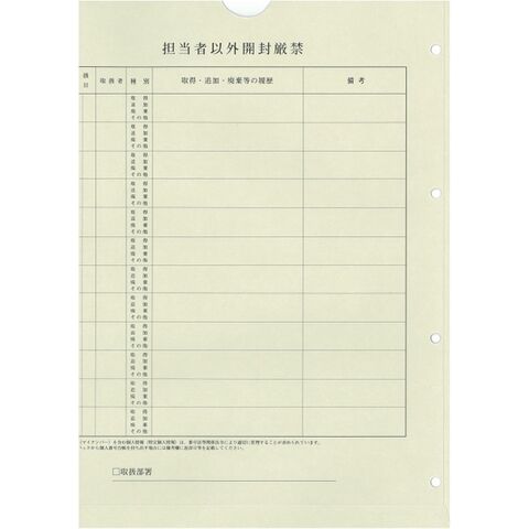 個人番号台帳兼届出書(マイナンバー2-1)および扶養親族分の本人確認書類等を世帯単位で保管・管理できる専用封筒になります。個人番号台帳兼届出書(マイナンバー2-1)の社員情報欄のみ見えるようにカットを入れてありますので、中身を取り出さずに誰の書類であるかを確認することができます。また、封筒には利用記録を記載できる管理表を設けてありますので、個人番号の取得、利用、廃棄などの番号法の求める利用記録を記載することができます。●セット内容: 個人番号台帳保管パック A4用 10入