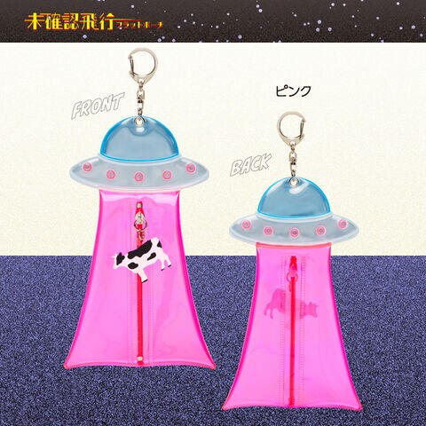 未確認飛行 フラットポーチ ピンク キーホルダー UFO 牛 リフレクター 小物入れ 推し活 面白グッズ サンスター文具