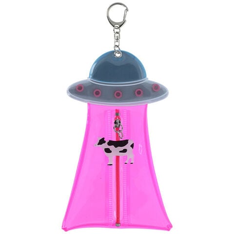 【送料無料】未確認飛行 フラットポーチ ピンク キーホルダー UFO 牛 リフレクター 小物入れ 推し活 面白グッズ サンスター文具 - メール便発送