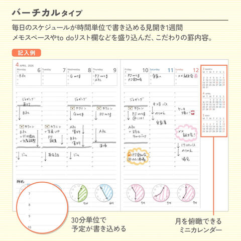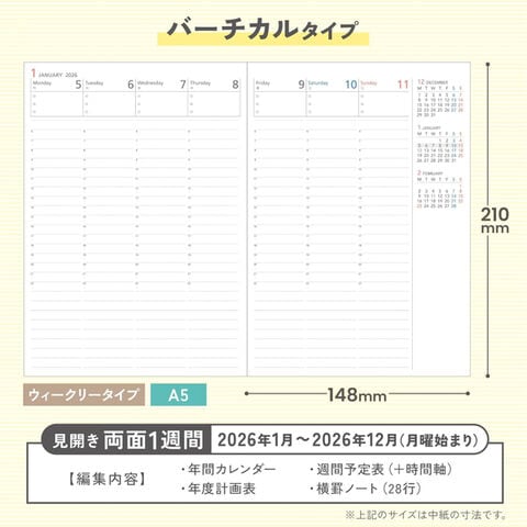 【編集内容】 年間カレンダー・週間予定(見開き1週間+時間軸)・年度計画表・横罫(28行)