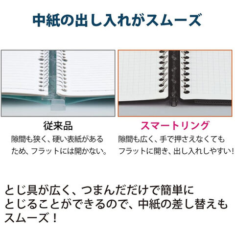「スマートリング」とじ具採用で、表紙を折り返すことができるので、狭い場所や立ったままでも筆記がしやすくなっています。